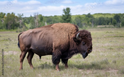 A wild American bison standing on a grassland prairie, with a thick brown coat, covered in dust, set against a golden grassland and clear sky