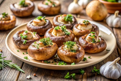 Baked mushrooms stuffed with garlic and fresh herbs, garnished with parsley. Suitable for the Mediterranean diet.