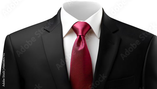 black suit with red tie, white shirt on a transparent background, ultra-realistic photography cutout