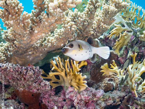 コクテンフグ, フグ科, Blackspotted puffer, Arothron nigropunctatus, 美しいサンゴ礁と熱帯魚の群れ。 安慶名敷島沖縄県 島尻郡慶良間諸島座間味島-2025 沖縄本島から40km西方の諸島。30以上の島嶼群全体が国立公園に指定。珊瑚礁の青い海と白い砂浜は世界屈指の美。貴重な動植物が多数生息。