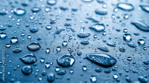 Blue surface dotted with drops of water; backdrop of blue sky and additional drops