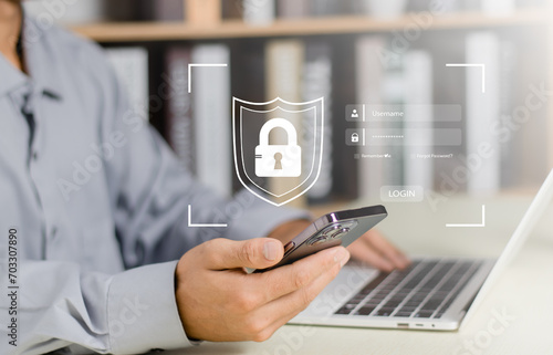 Businessmen protecting personal data on laptop and virtual Cybersecurity and privacy concepts to protect data. Lock icon and internet network security technology interfaces..