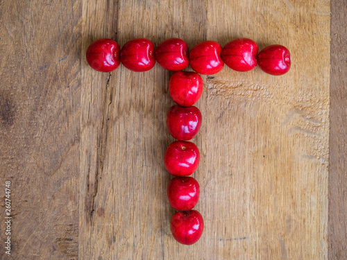 cherry on wooden background as a letter
