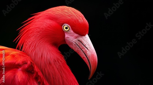Close-up of a red bird with a long neck and large beak against a black backdrop Yellow eye is prominent