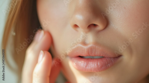Close-up of a skincare serum being applied to a face, natural lighting, clean minimal aesthetic, soft skin texture, macro shot of the product’s effect