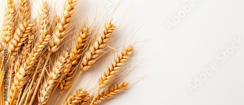 Close-up of wheat bundle on white background with copious space in bottom right corner