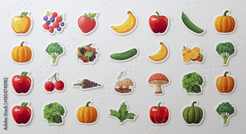 Colorful collection of cute fruit and vegetable sticker icons on white background, healthy food illustration set with apples berries bananas pumpkins broccoli cucumber mushrooms and leafy greens for