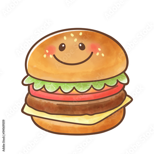 hamburger, watercolor, food, isolated, character, hand-drawn, illustration, cute, personification, smiling, face, children, clip art, menu, white background, fresh, burger, fast food, sandwich, lunch, beef, lettuce