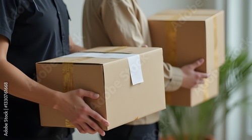 Delivery person holding cardboard boxes with stacked packages and shipping labels