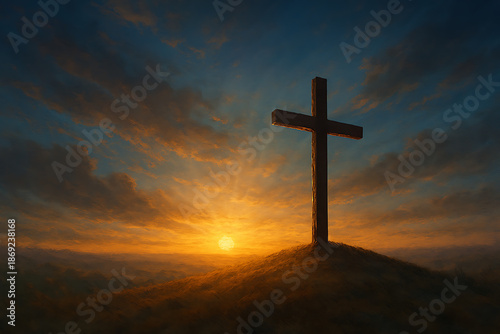 Digital painting of Cross on hill at sunrise in sunrise or sunset background with cinematic lighting