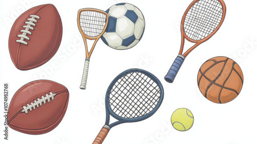 "Diverse Sports Equipment: American Football, Soccer Ball, Tennis Racket, and Basketball"