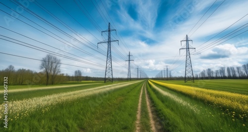 clear day, horizon, blue skies, yellow flower, countryside, powerline, calmness, natural beauty, open air, greenfield, open space