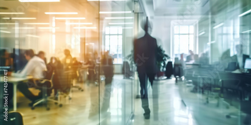 empty glass office with various people sitting and working, blurry images of company executives and employees in an office