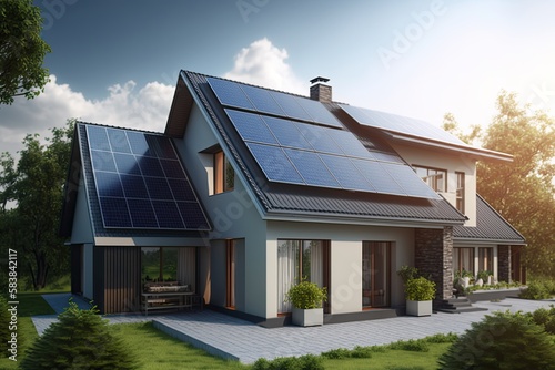 solar, panel, house, lawn, countryside, tree, building, residential, picturesque, environment, exterior, modern, construction, facades, roof, architecture, sky, renewal, energy, blue skies, alternative, power, industry, contemporary, nature, sunlight, sustainable, summer, green, peaceful, photovoltaic, property, meadow, scenery, scenic, grassy, greenery, growth, flora, infrastructure, development, ecology, structure, field, plant, grass, generative, ai