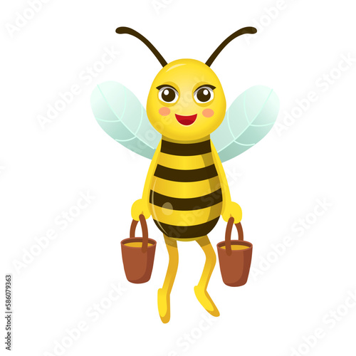 Funny cartoon bee. Bee carry nectar, honey in buckets. Cartoon bee for children on a white background