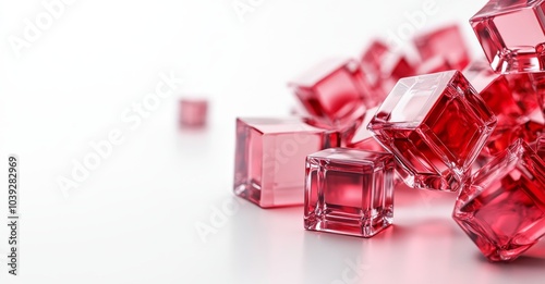 Glass transparent cubes on light background, red and pink color palettes, business background, cosmetic perfume background
