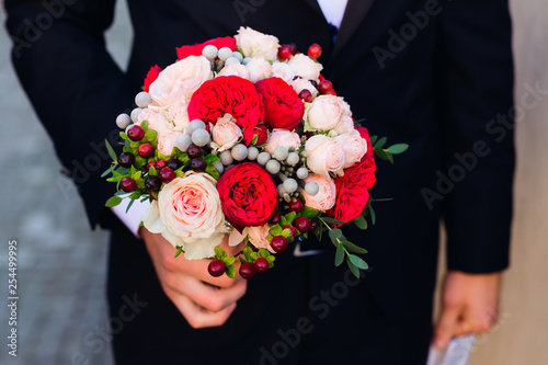 wedding, groom, wedding bouquet, hand, suit, rose, closeup, finger, bouquet, bouquet, flower, fiance, husband, successful, berry, green leaf, leaf, blossom, floral, nature, design, love, marriage, holiday, romance, happy, married, event, to marry, day, decoration, tradition, copy space, background, indoor, studio, room, lifestyle, atmosphere, harmony, perfection, glamour, joy, magnificent, unusual, beauty