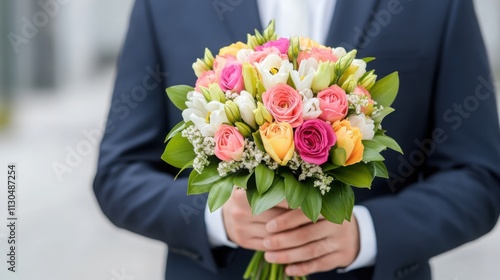 man in a suit holding a vibrant bouquet of spring flowers, featuring a mix of roses, tulips