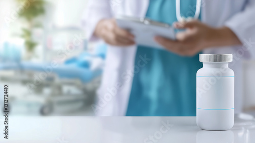 Medical Center Banner with Healthcare Workers and Blurred Background for Text