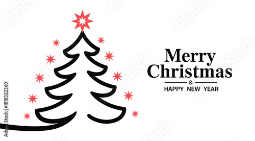 Minimalist “Merry Christmas & Happy New Year” text with stylized tree, red stars, and festive swirls for seasonal greeting design
