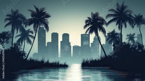monochromatic cityscape with palm trees silhouetted against a misty, calm skyline, creating a serene and mysterious tropical scene.