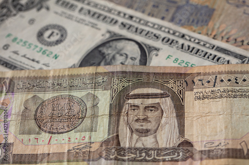old one riyal of Saudi Arabia and 1 US dollar banknotes