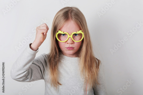 Portrait of naughty angry little girl in glasses making faces at camera with clench fist. Expressive facial expressions . Human emotions, reactions, feelings and attitude .