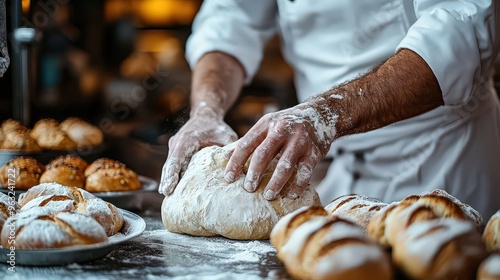 Professional baker working with dough, forming bread loaves by hand, covered in flour, in a traditional bakery, creating fresh, homemade bread.