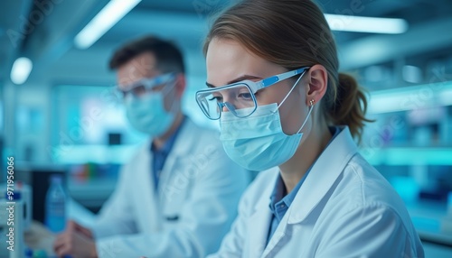 clean, blue, goggles, safety, coat, work, mask, protective, professional, research, environment, technology, scientist, earring, earring, laboratory, equipment, hair, female, laboratory