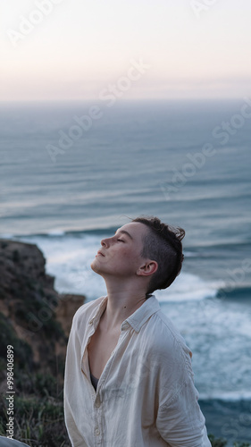 serene, ocean, breeze, sunset, viewpoint, relaxation, peaceful, nature, calmness, horizon, reflective, meditative, fresh air, coastal, contemplation, escape, solitude, mindfulness, soft light, calm, freedom, cliff, sea, person, short hair, scenic