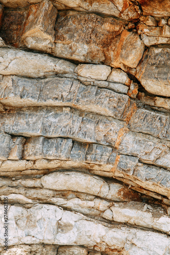 Stone walls and rocky shore. Rocks in the Bay of Budva, Montenegro.
