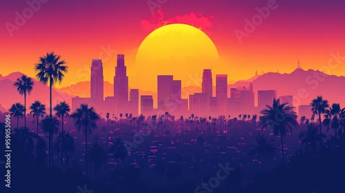 striking sunset over the city, with a large sun and palm trees casting long shadows, creating a dramatic skyline view.