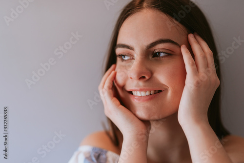 woman, portrait, young, beauty, beautiful, face, skin, smile, people, hair, white, person, model, eye, isolated, 1, hand, cute, smiling, fashion, happy, human, head, care, natural, student, teeth, standing, cosmetic, health, glamour, skincare, casual attire, freckle, happiness, brunette, look, fresh, closeup, girl, teenage