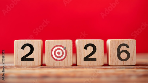wooden blocks arranged in a horizontal line on a wooden surface. Each block displays a single black numeral, collectively forming the year 2026