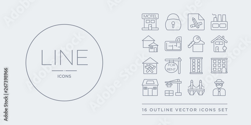 16 line vector icons set such as agent, bridges, constructions, cottage, facade contains flat, for rent, home repair, house front view. agent, bridges, constructions from real estate outline icons.
