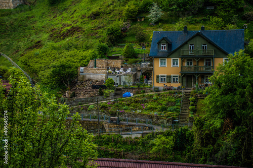 18 May 2019 Rathen, Saxony, Germany - Narrow mountain paths and cozy residential houses at Kurort Rathen, small town on river Elbe, opposite to Bastei Bridge