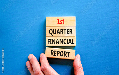1st quarter financial report symbol. Concept words 1st quarter financial report on beautiful wooden blocks. Beautiful blue background. Business 1st quarter financial report concept. Copy space.