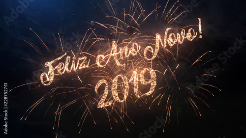 2019 Happy New Year greeting text in Portugal with particles and sparks on black night sky with colored fireworks on background, beautiful typography magic design.