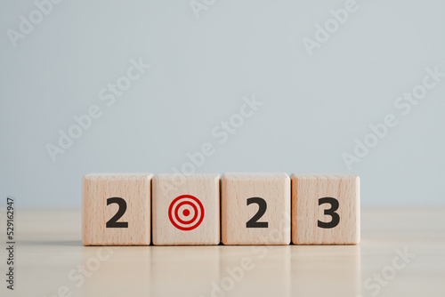 2023 new year challenge goal and target, Achievement and business success. 2023 word on wooden blocks and red dartboard icon. Happy new year 2023. Business and financial concept.