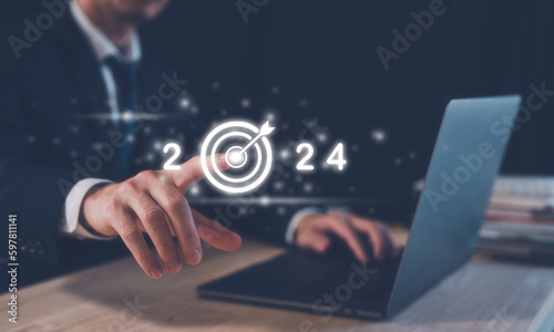 2024 business planning strategy concept, businessman pointing virtual icon of the year 2024 target darts working on computer, marketing financial and research analysis, investment trends next year