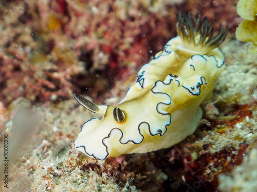 美しいキイロウミウシ(イロウミウシ科)。 日本国静岡県伊豆半島賀茂郡南伊豆町中木から渡し船で渡るヒリゾ浜-2024年7月 The Beautiful Colorful Black-margined glossodoris sea slug (Doriprismatica atromarginata).