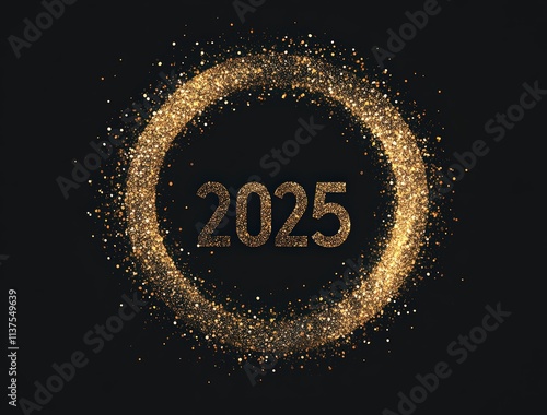 2025 New Year card background with golden confetti on a dark blue, gold dot pattern. A circular pattern made up of small gold particles forms an oval frame around it. new year greeting card or poster