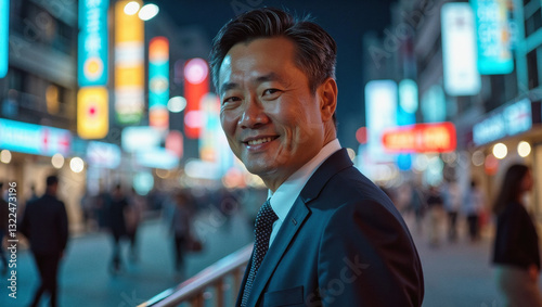 2025 summer idea trend concept: A man in a suit stands in front of a city street at night, smiling