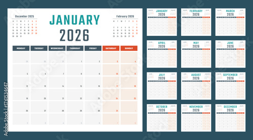 calendar, 2026, year, month, design, template, organiser, day, date, vector, monthly, illustration, simple, event, business, week, planner, new, diary, schedule, jan, graphic, office, december, season, element, page, march, holiday, daily, february, annual, monday, flat, company, european, abstract, card, english, pocket, vertical, april, may, june, july, august, september, october, november