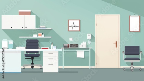2d, flat design, simple style, modern style, soft and natural color, clean line, doctor's study room wall