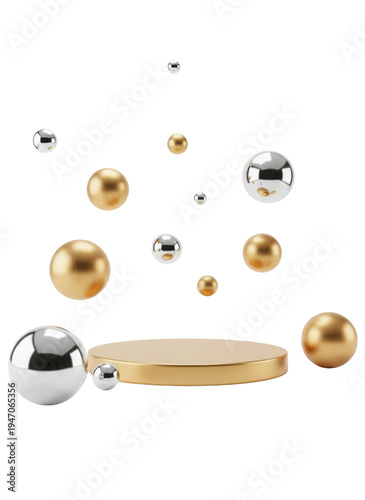白い背景に浮かぶ金と銀の光沢のある球体と、中央に配置された円形の金色の表彰台。製品ディスプレイやプロモーションに最適なミニマルな3Dレンダリング。