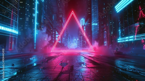 3d abstract neon background, cyber space virtual reality scene, glowing triangular shape portal at the end of the street, fantastic city, minimal skyscrapers, post apocalyptic urban concept, night sky