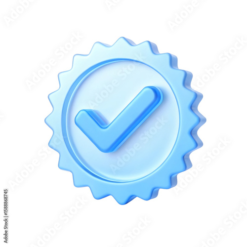 3d blue checkmark inside a circular badge with jagged edges representing approval and verification isolated on transparent background