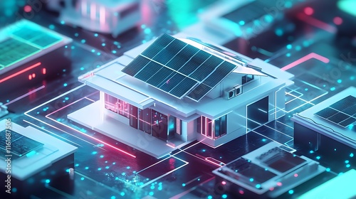 3D Blueprint of a Solar-Powered House with Roof Panels on the circut