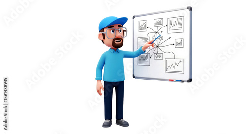 3D Cartoon Businessman Presenting Charts on Whiteboard: Strategy, Data Analysis, and Growth